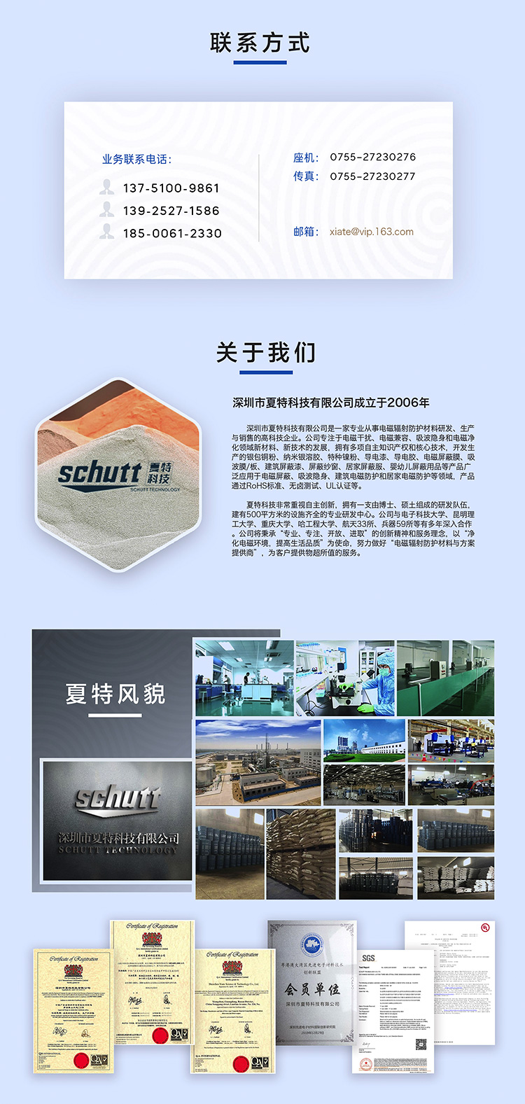 深圳市夏特科技有限公司(0755-27230276)是一家专业研发,生产和销售屏蔽油漆、导电漆的高新技术企业.产品主要涵盖银铜系列,银系列,镍系列,墙壁专用屏蔽系列等多种型号的导电漆、屏蔽漆